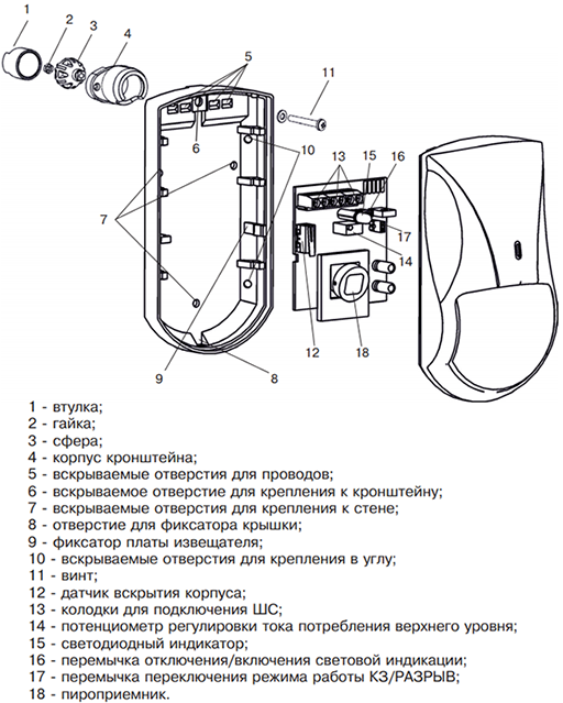 - Монтажный кронштейн, обеспечивающий удобство установки и ориентации зоны обнаружения.